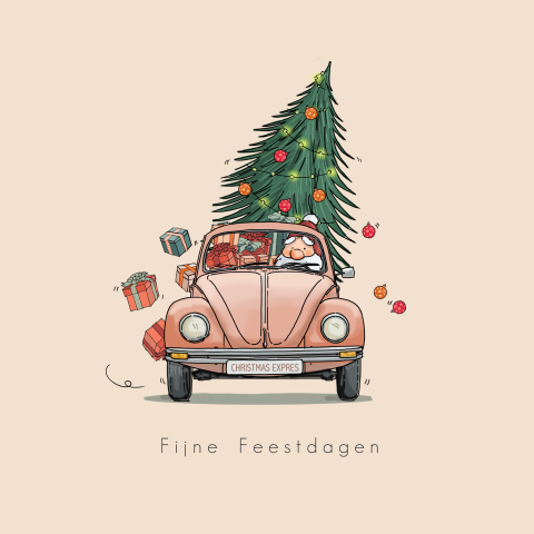 Getekende kerst kaart met VW kever roze met kerstboom